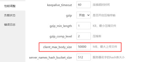 最后点击宝塔面板左侧 ⇒ 软件商店 ⇒ 找到Nginx,点击右侧设置按钮,找到性能调整,修改client_max_body_size参数值,如图: