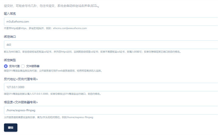 基本上只需要填入域名,反向代理打勾,其他默认,最后提交即可。